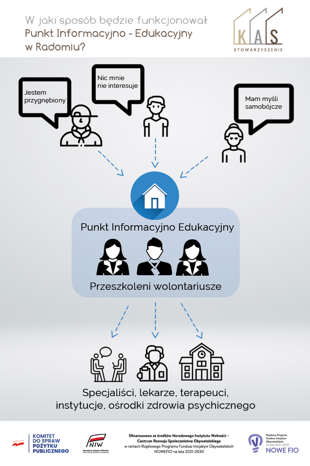 Zależy nam na stworzeniu miejsca w Radomiu, które będzie przyjazne młodym osobom w kryzysie psychicznym – oraz ich rodzicom – i pomoże podjąć właściwe decyzje w procesie wychodzenia z tego kryzysu – mówi Agnieszka Sekulska, Prezes Stowarzyszenia KAS Kombinat AKtywności Społecznej w Radomiu, które jest pomysłodawcą całego przedsięwzięcia. – W tym celu, chcemy nie tylko regularnie szkolić wolontariuszy z zakresu pierwszej pomocy psychologicznej, ale także połączyć siły i koordynować pomoc psychologiczną świadczoną przez specjalistów, instytucje publiczne i organizacje pozarządowe. Wszystko po to, aby uczynić ją skuteczniejszą, przyczyniając się w ten sposób do ograniczenia skali prób samobójczych podejmowanych przez dzieci i młodzież – dodaje.